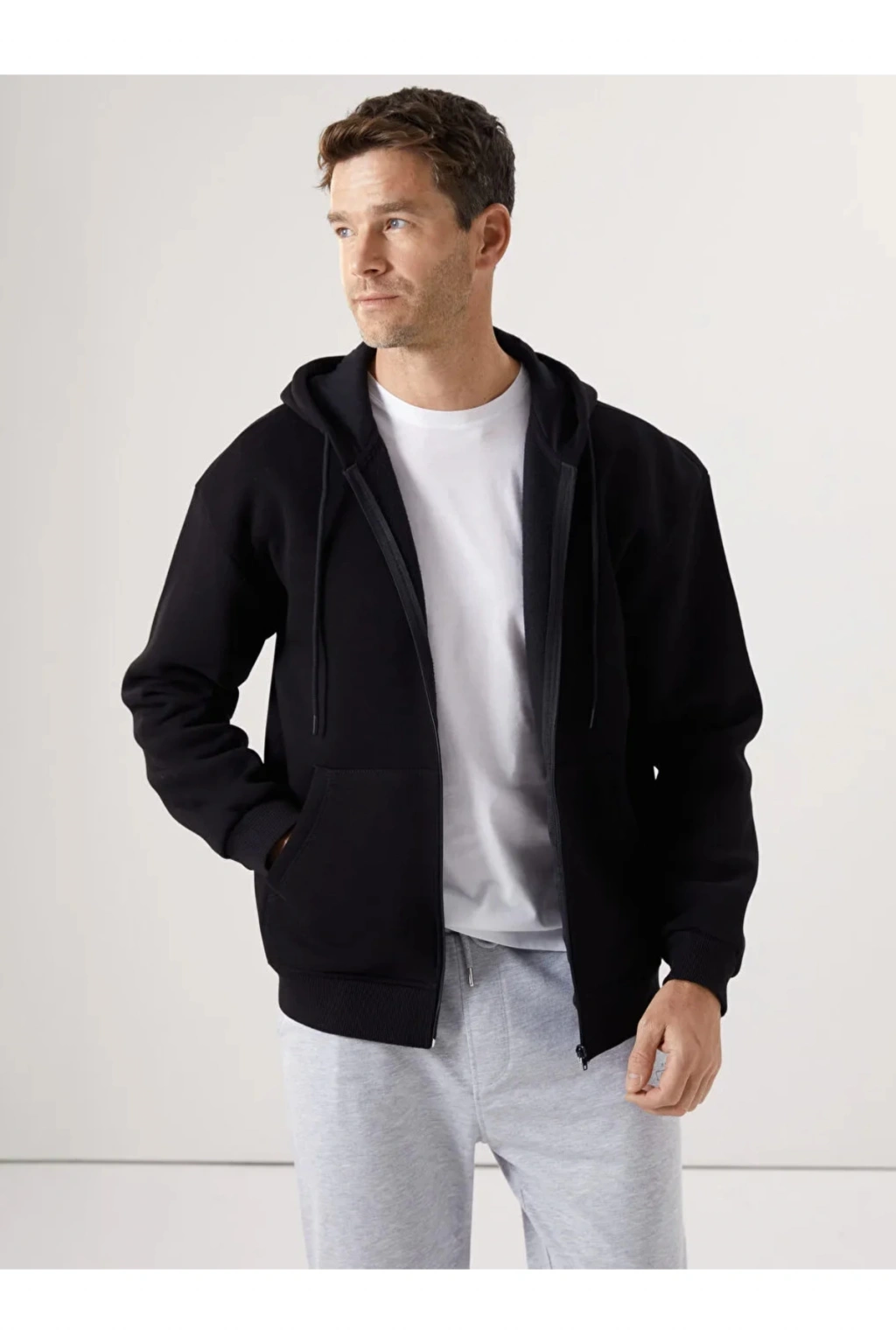 Classic Siyah Kapüşonlu Uzun Kollu Erkek Fermuarlı Sweatshirt