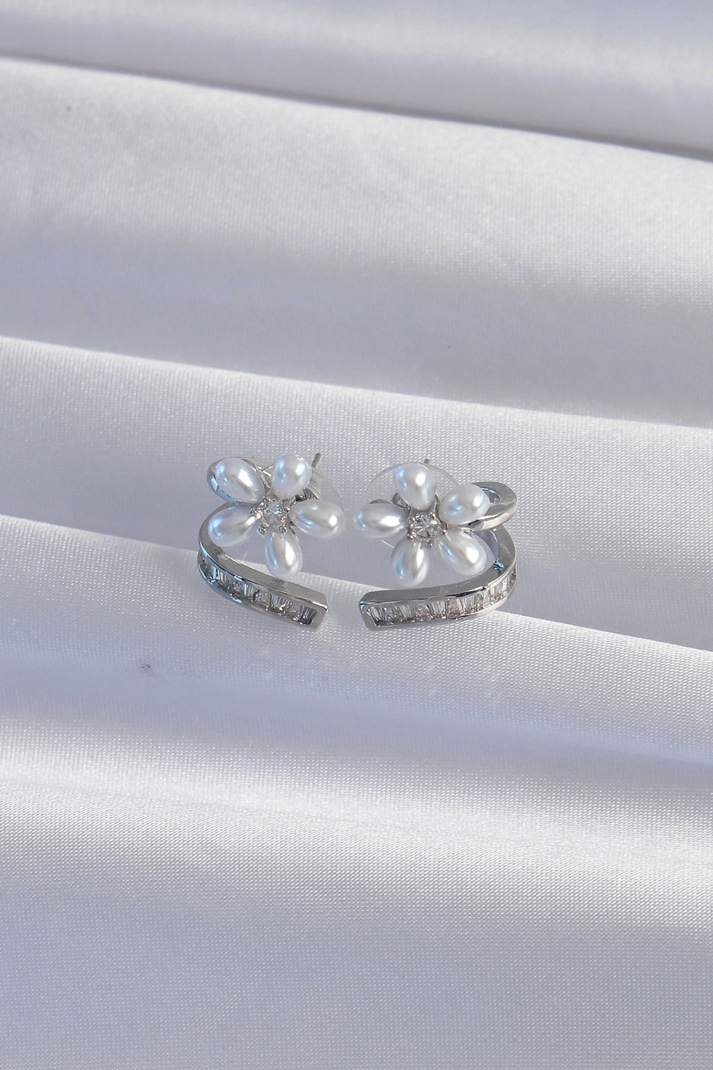 Pirinç Gümüş Renk Zirkon Taşlı Kıvrımlı İnci Çiçek Küpe